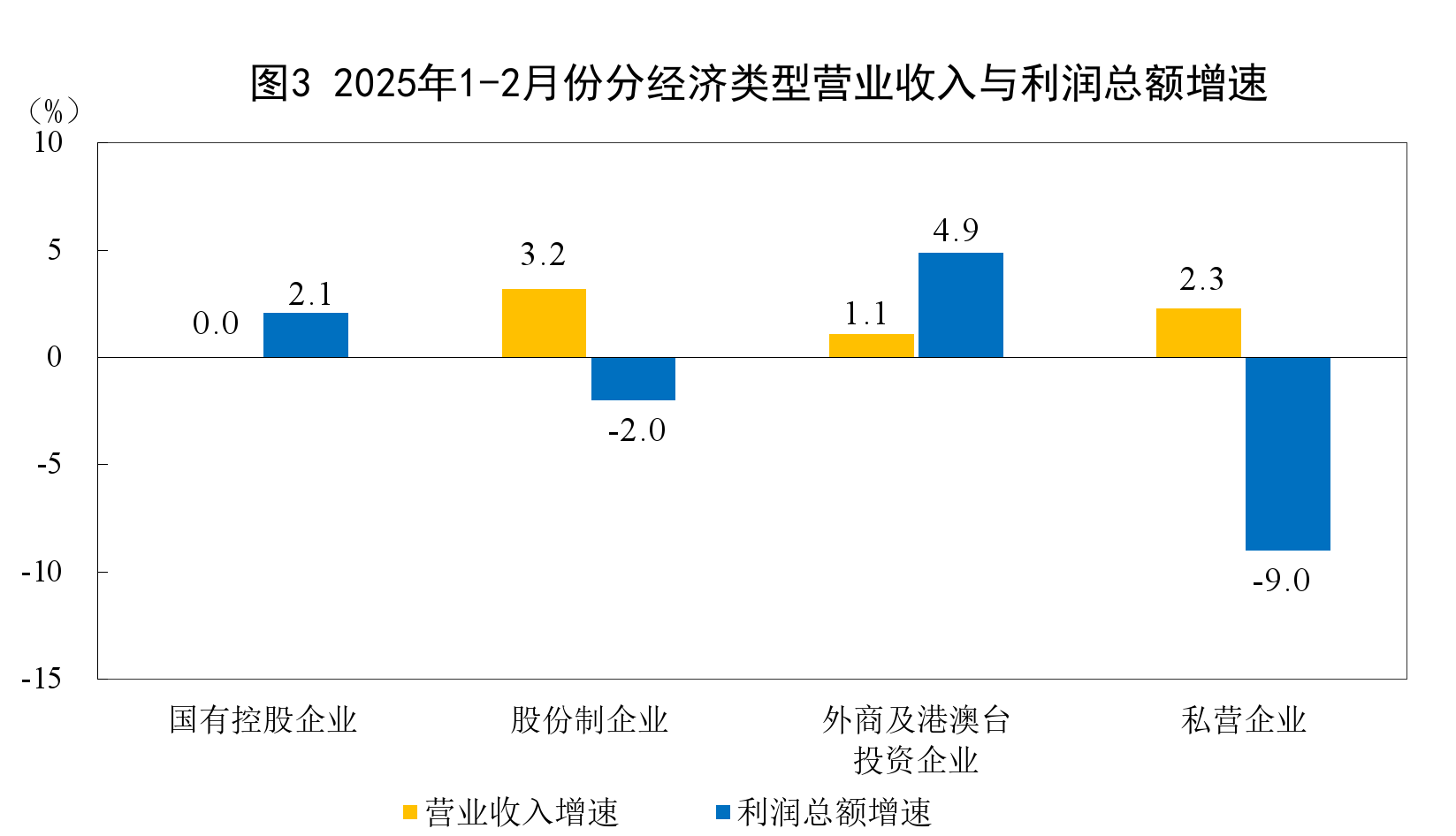 1—2月份,规模以上工业企业中,国有控股企业实现利润总额3487.7亿元,同比增长2.1%;股份制企业实现利润总额6739.2亿元,下降2.0%;外商及港澳台投资企业实现利润总额2304.6亿元,增长4.9%;私营企业实现利润总额2209.9亿元,下降9.0%。