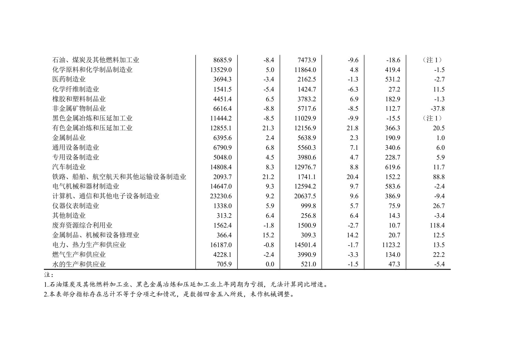17.在各表的利润总额同比增长栏中,标“注”的表示上年同期利润总额为负数(即亏损)或为0.0亿元;数值为正数的表明利润同比增长;数值在0至-100%之间(不含0)的表明利润同比下降;下降幅度超过100%的表明由上年同期盈利转为本期亏损;数值为0的表明利润与上年持平。