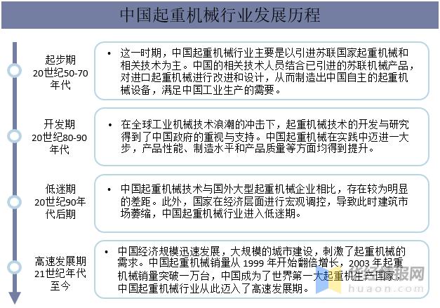 我国起重机械行业起步于20世纪50年代,从诞生到现在经历了六十多年的发展,大致上可分为四个发展阶段:起步期(20世纪50-70年代)、开发期(20世纪80-90年代)、低迷期(20世纪90年代后期)、高速发展期(21世纪年代至今)。
