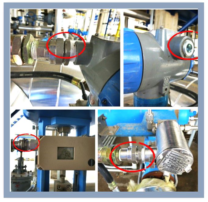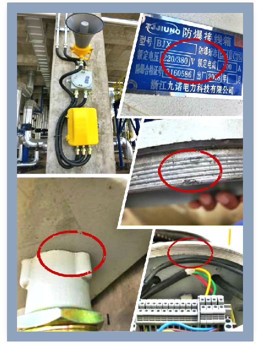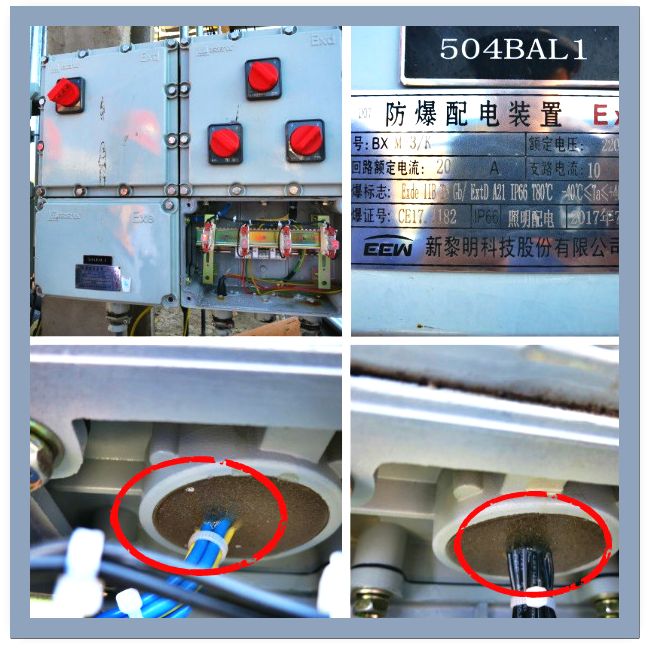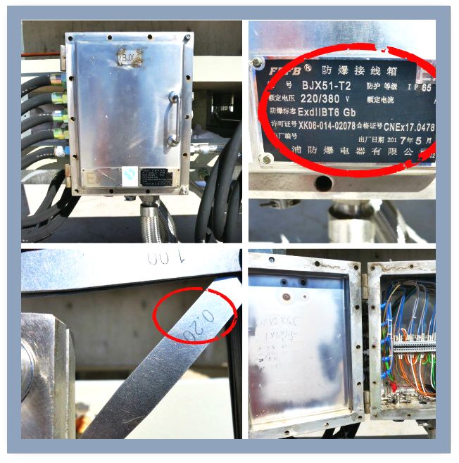 该产品为隔爆型产品,但防爆盖上安装的指示灯及按钮与防爆壳体之间无隔爆结构(箱内装有非防爆电器元件),隔爆接合面严重锈蚀,不符合防爆标志规定,丧失防爆性能。