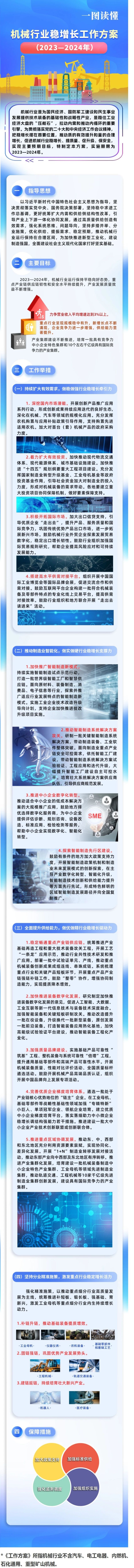 导 读 为促进机械行业稳增长、提质量、促升级、保安全,工业和信息化部、财政部、农业农村部、商务部、海关总署、金融监管总局、国家药监局等七部门近日联合印发《机械行业稳增长工作方案(2023—2024年)》,提出2023—2024年,机械行业运行保持平稳向好态势,重点产业链供应链韧性和安全水平持续提升,产业发展质量效益不断增强。具体目标有:力争营业收入平均增速达到3%以上,到2024年达到8.1万亿元;重点行业呈现规模稳中有升,新增长点不断涌现,企业竞争力进一步增强,供给能力显著提升;产业集群建设不断推进,培育一批具有竞争力的中小企业特色集群和10个左右千亿级具有国际竞争力的产业集群。
