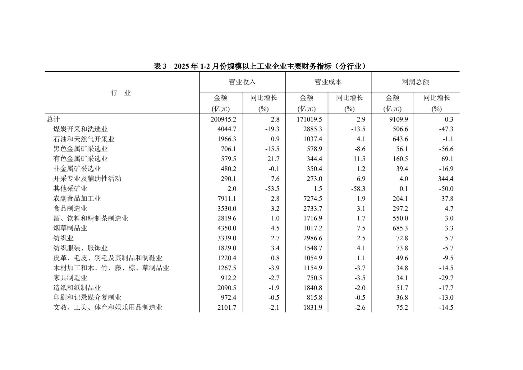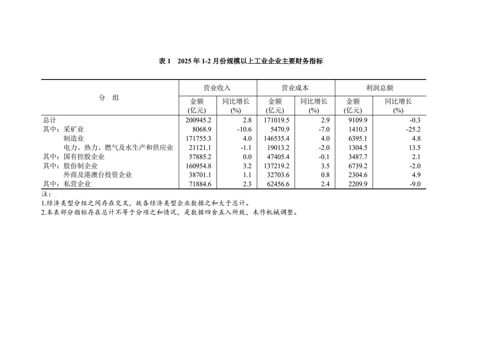 1—2月份,全国规模以上工业企业实现利润总额9109.9亿元,同比下降0.3%(按可比口径计算,详见附注二)。