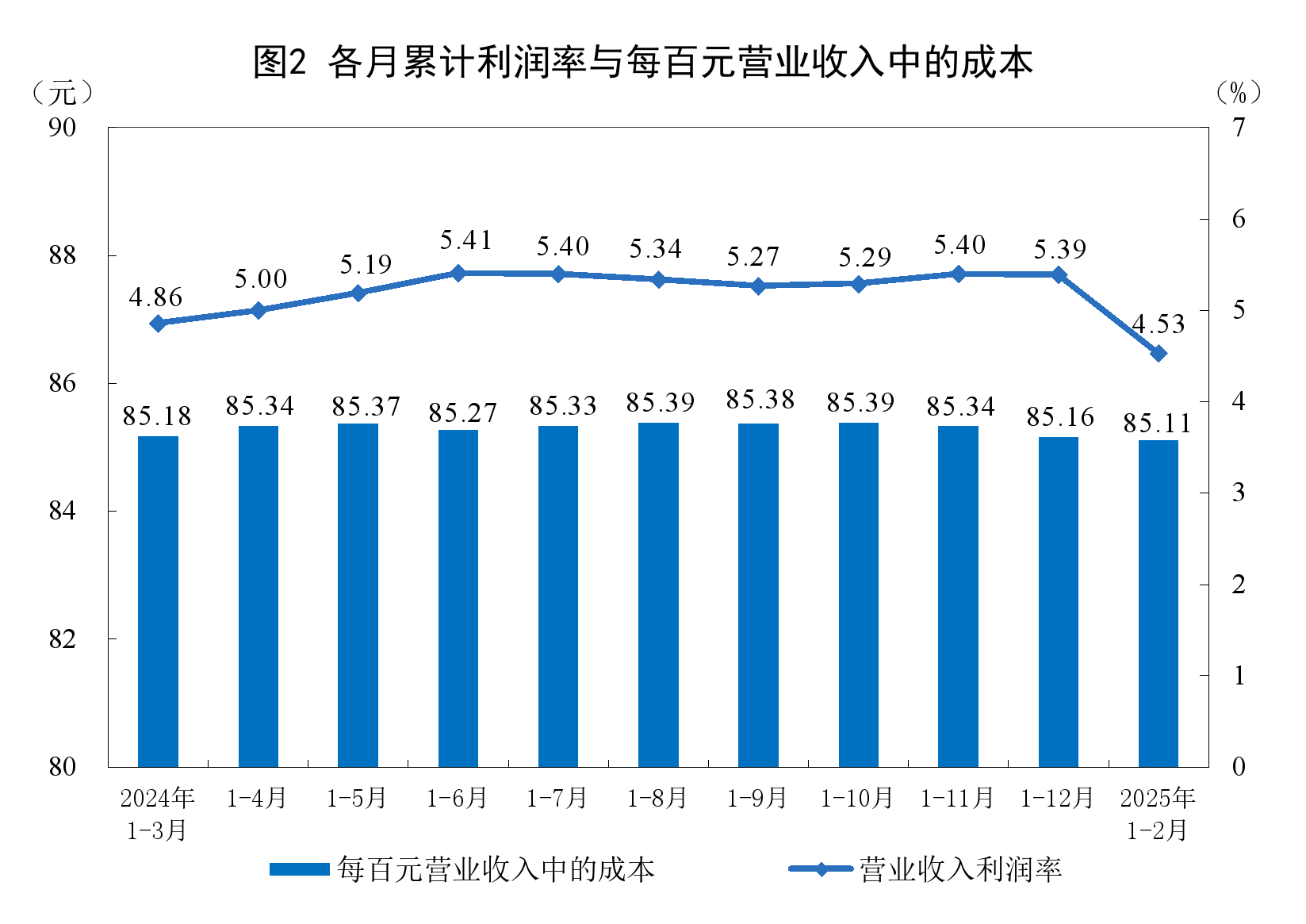 1—2月份,规模以上工业企业每百元营业收入中的成本为85.11元,同比增加0.11元;每百元营业收入中的费用为8.56元,同比减少0.09元。