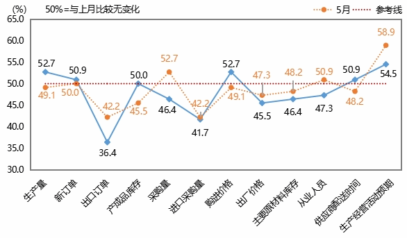 原材料库存持续下行,交货速度较上月加快。6月份的主要原材料库存指数为46.4%,比上月下降1.8个百分点,处于收缩区间。原材料库存指数继5月份首次进入收缩区间后继续下行,表明大部分企业在原材料采购方面有所放缓,以消化当前库存量为主,释放库存成本压力。供应商配送时间指数为50.9%,比上月回升2.7个百分点,表明行业企业生产活动加快,市场需求温和改善,供应商交货效率提升。