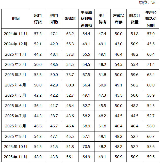 市场需求保持景气,出口订单重返收缩区间。11月份的新订单指数为54.4%,比上月下降1.0个百分点,中小型电机行业的市场需求整体处于景气区间,但扩张速度有所放缓。出口订单指数为48.9%,比上月下降5.6个百分点,经过2个月的短暂回升,本月重返收缩区间。相较于2024年11月,出口订单指数下降8.4个百分点,说明尽管目前中美贸易关系趋于缓和,但外贸政策对行业出口依然影响较大。