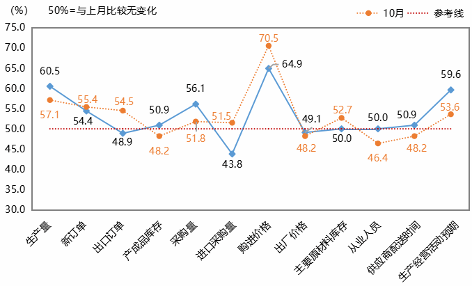 生产活动持续活跃,产成品库存同步扩张。11月份的生产指数为60.5%,比上月上升3.4个百分点,处于60.0%以上高位景气区间。产成品库存指数为50.9%,比上月上升2.7个百分点,在连续八个月运行于荣枯线及以下后重返扩张区间。随着新订单连续三个月扩张,企业的生产活动进一步加快,产成品库存也同步有所增加。
